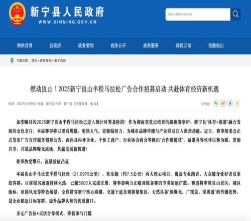 杨松透露,“许多赛事运营的同行也是这个情况,大家都是被直接通知取消。”时代财经留意到,2025新宁崀山半程马拉松在10月11日发布比赛取消通知,而新宁县人民政府官网10月8日还在招募赛事的广告合作商。