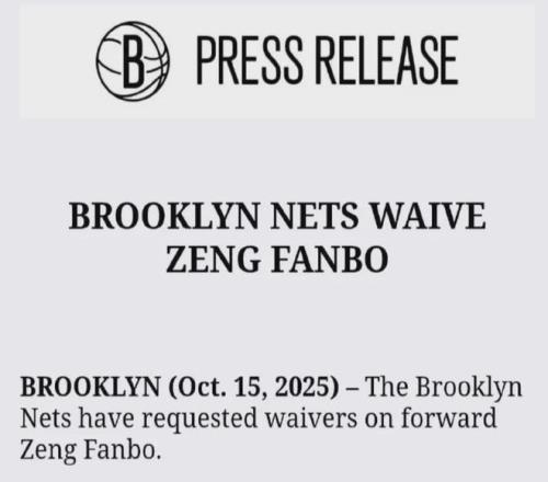 今天凌晨,篮网官方宣布,曾凡博被裁员。
