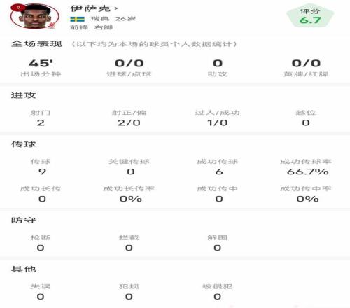 统计显示,伊萨克本场比赛射门2次,均射正,但未能进球。