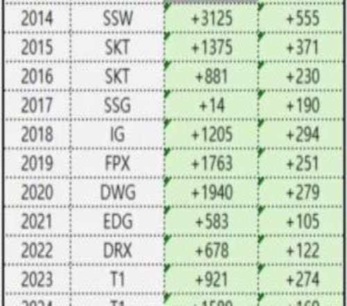 体育资讯11月10日称 昨日S15全球总决赛上,T1击败KT夺得冠军,赛后韩网整理历年S赛冠军的前15分经济差,其中今年T1是唯一一支负15分经济差夺冠的队伍!