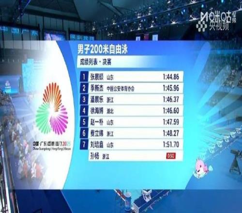 11月12日,2025年第十五届全运会游泳男子200米自由泳决赛:张展硕1分44秒86获得冠军的同时打破全国青年纪录,季新杰1分45秒96获得亚军,潘展乐1分46秒37获得季军,孙杨犯规。