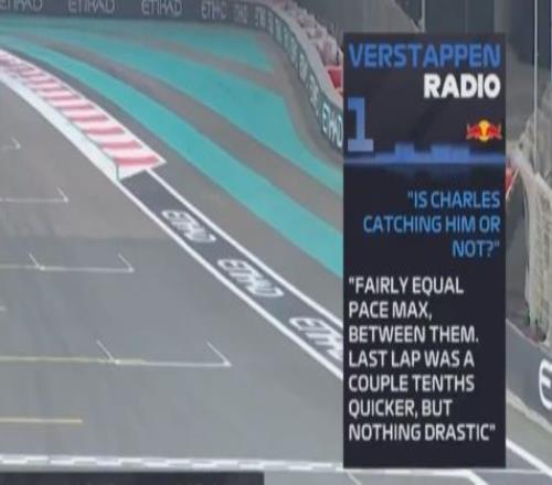 第48圈,领跑的维斯塔潘通过TR询问车队,自己的“兄弟”勒克莱尔有没有追上诺里斯?但车队表示:“他们两人的节奏基本相当,上一圈勒克莱尔快了零点几秒,但优势并不明显。”维斯塔潘听完这个话,可能心都凉透了......毕竟诺里斯只要上领奖台,他就将夺得WDC,而此时诺里斯排名第三。