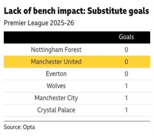 本赛季至今,曼联的替补球员在英超联赛的进球为0