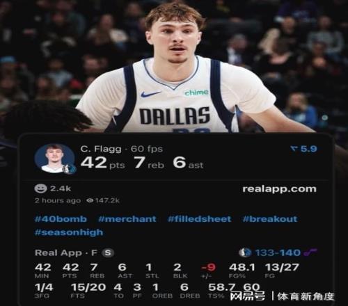 这场比赛最最最关键的是啥?这可是弗拉格的认证大作战”啊!今天这场打完,谁还敢说弗拉格这位状元有“水掉”的可能?全场比赛,弗拉格那可是火力全开,打了41分钟呢!27次出手,中了13个,罚球20次,进了15个,直接拿下42分7板6助。这42分,不仅刷新了他自己的个人生涯得分纪录,还追平了独行侠队史新秀得分纪录哟(想当年马克 - 阿吉雷新秀时期在独行侠也拿过42分呢)。嘿,就连东契奇和诺天王都没达成过这个成就呢!这可是弗拉格生涯的第一个40+,这会不会像开了闸的洪水一样,第一个来了,后面就“哗啦啦”地无数个接踵而至啦?