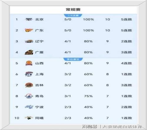 卫冕冠军广厦男篮和山西男篮取胜之后,总战绩变为4胜1负,与辽宁一起排名前五,上海队3胜2负排名第6;