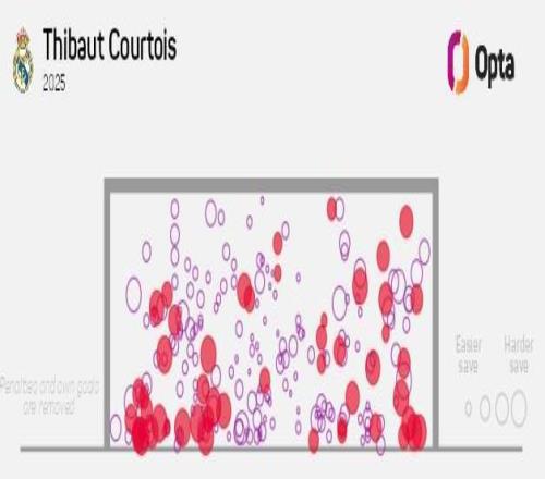 据Opta统计,库尔图瓦(174次)是2025年五大联赛扑救次数最多的门将。