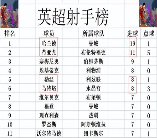 射手榜方面,哈兰德今天错失绝佳机会未能破门,还是19球领跑,蒂亚戈11球位列第2。塞梅尼奥9球排在第3,马特塔今天打入一球后,追上埃基蒂克和勒温,3人8球并列第4。福登,理查利森等人7球刚好挤入前十。