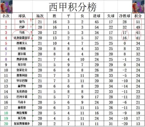 积分榜方面,皇马上半程一度5分优势力压巴萨领跑,但后来反过来被巴萨反超,今天先赛客场击败强敌后,皇马终于是以2分优势暂时夺回了榜首位置。比利亚雷亚尔完败后,差马竞一个净胜球,跌出前3。