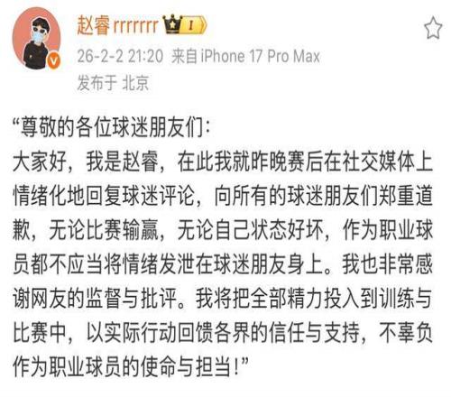 面对汹涌舆情,赵睿在24小时内火速更新社交动态,公开致歉:“昨晚赛后在社交媒体上情绪化地回复球迷评论,向所有球迷朋友们郑重道歉。无论比赛输赢,无论自己状态好坏,作为职业球员,都不应将情绪发泄在球迷身上。”言辞诚恳,态度明确。这一及时止损的举动,虽未能完全平息争议,但至少展现了职业球员应有的担当。