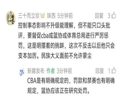 虽然随后赵睿也进行了道歉,不过很多球迷认为,这件事不是只道歉就能够过去的,赵睿应该被重罚。对此《新疆发布》也进行了回应,表示“篮协应该正在研究处罚”。也就是说,因为这次的不当言论,赵睿是肯定要被处罚了,而且被罚的力度恐怕会比较大。这也难怪,就连新疆自治区新闻办公室都亲自下场表明态度了,篮协方面再没有处罚措施就说不过去了。